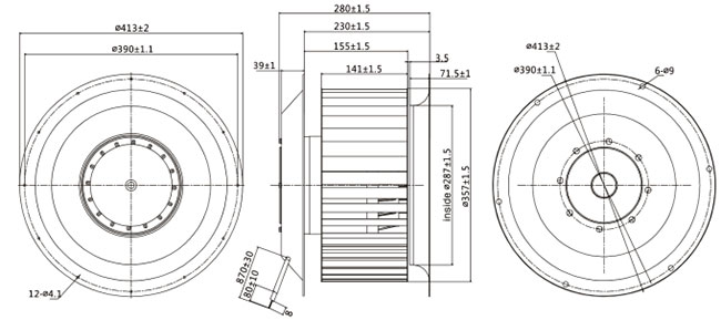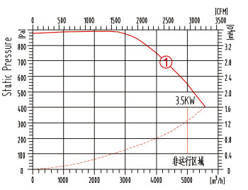 1. 性能參數(shù):風(fēng)輪直徑355mm,由4極和6極額定電壓為230/400V,頻率50Hz三相異步運(yùn)轉(zhuǎn)電機(jī)組成。最大風(fēng)量分別為7000m3/h和4032m3/h,與之相對(duì)應(yīng)的轉(zhuǎn)速為1400rpm和870rpm。